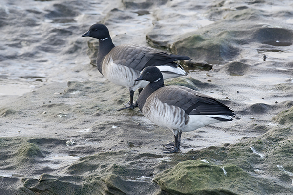 A short pre-tide visit found little on the rough sea except a Great Crested Grebe and 82 Common Scoters, a walk through the old obs garden however flushed a Short-eared Owl from underfoot that was obviously sheltering form the westerly wind. It flew south towards Middle Eye and seemed to land between the islands but was not seen again. Two Purple Sandpipers were at the north end; a Song Thrush and a Rock Pipit were noted, and a pair of Teal were in the gutter east of the obs (right, CJ).