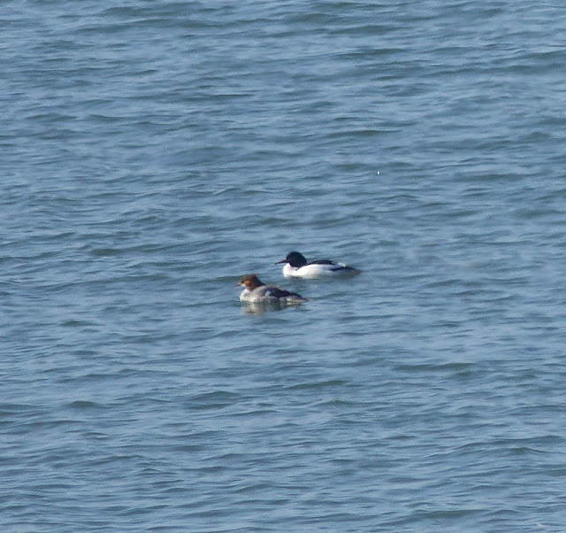 The regulars from yesterday were still about, 4 Goosanders and the male Eider. There were 2 Kestrels today, a Grey Heron and 9 Little Egret. Only 128 Brent counted today, some may have already left to go north. A Harbour Porpoise was sighted offshore, while unusually a Grey Seal was out on rocks at the north end.